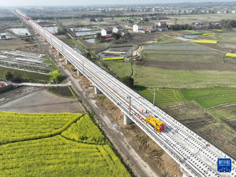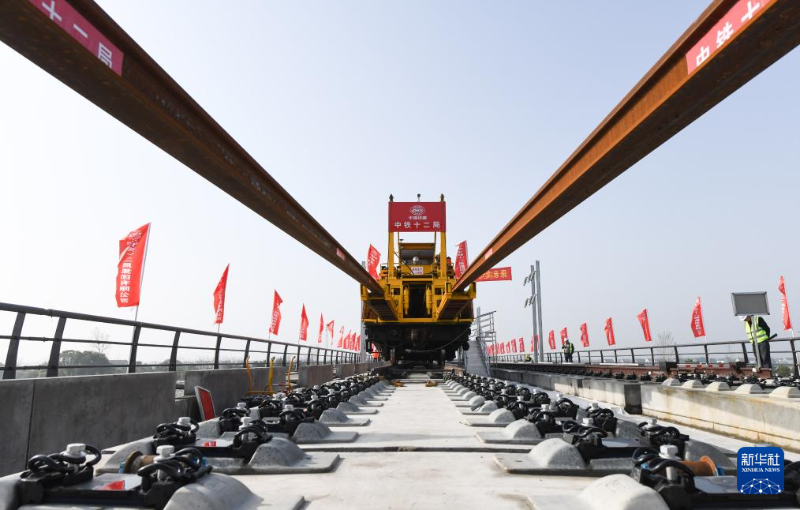 當日,隨著首對500米長鋼軌平穩(wěn)鋪設在無砟道床上,荊荊高鐵(荊門至荊州高速鐵路)全線正式進入無砟軌道鋪設階段。