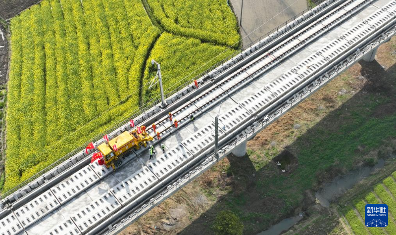3月28日,牽引車在進行鋪軌作業(yè)(無人機照片)。
