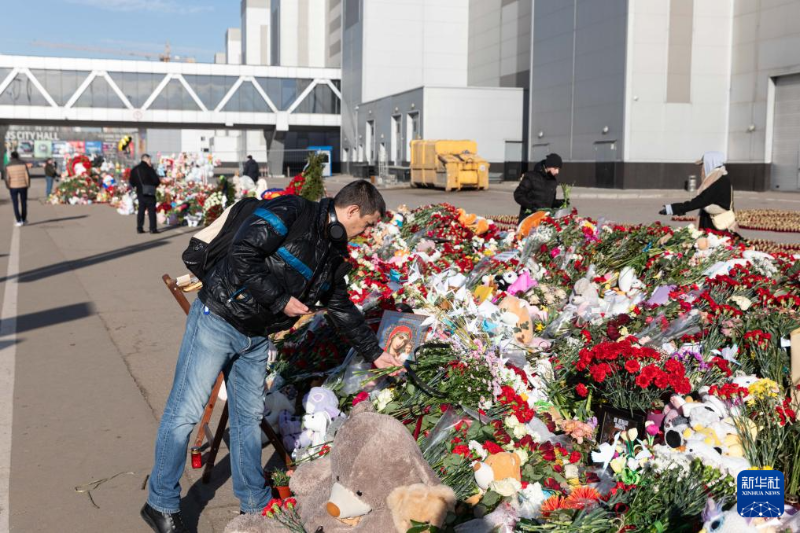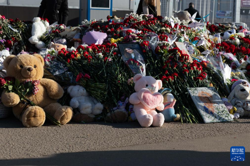 3月28日,人們在俄羅斯首都莫斯科近郊“克羅庫斯城”音樂廳前擺放鮮花和玩具,悼念遇難者。