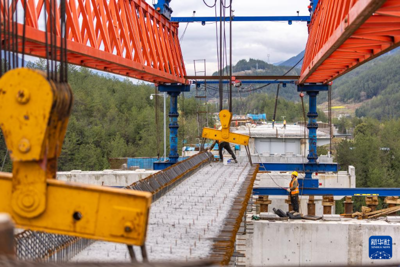 ??3月27日,在重慶巨能中環(huán)建設(shè)承建的巫云開(kāi)高速土建A3標(biāo)段,施工人員進(jìn)行預(yù)制T型梁吊裝作業(yè)。