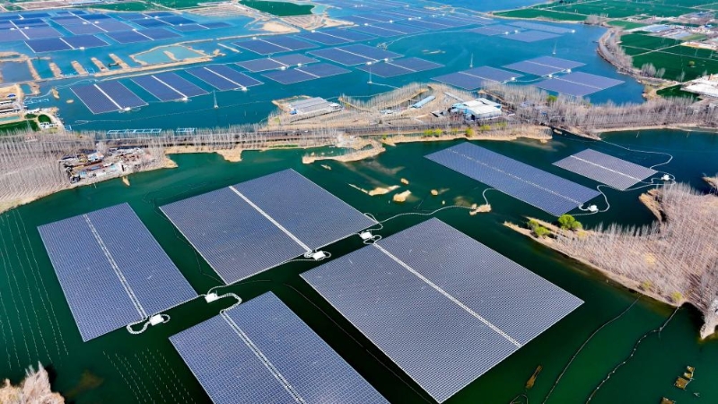 這是山東省濟(jì)寧市微山縣驩城鎮(zhèn)利用采煤塌陷區(qū)約3600畝水面建設(shè)的漁光互補(bǔ)項(xiàng)目(2024年3月20日攝,無人機(jī)照片)。該項(xiàng)目集光伏發(fā)電、漁業(yè)養(yǎng)殖、生態(tài)修復(fù)于一體。新華社記者郭緒雷攝