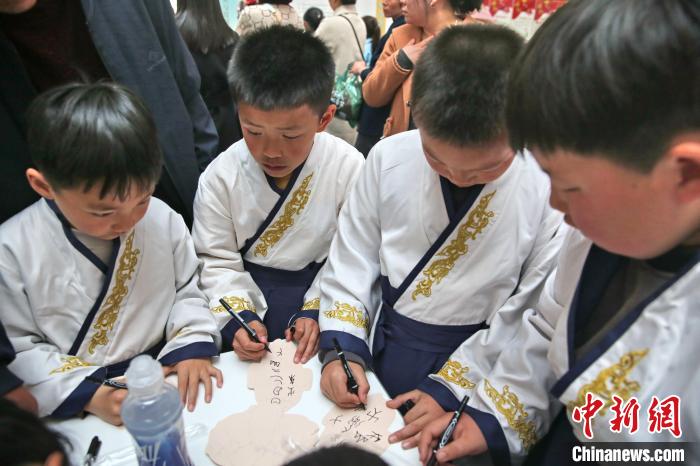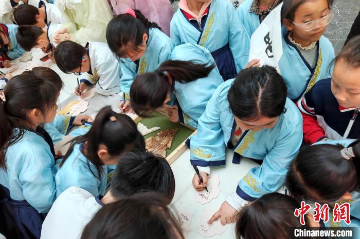 孩子們?cè)跁?shū)寫(xiě)甲骨文書(shū)簽。楊焱 攝