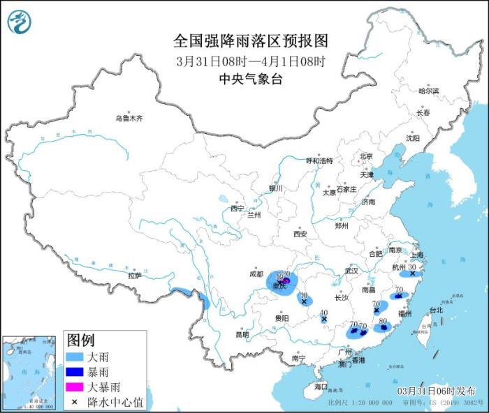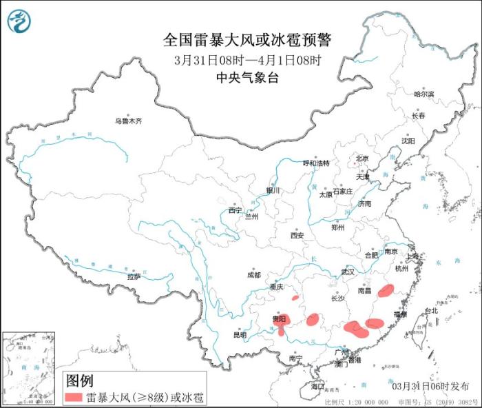 預計,3月31日08時至4月1日08時,重慶中西部、貴州北部、湖南西部和南部、江西南部和東部、浙江中部、福建北部和南部、廣東北部等地部分地區(qū)有大到暴雨,其中,重慶中西部局地有大暴雨(100~120毫米)。湖南南部和西北部、江西南部、福建、重慶東南部和西南部、貴州中東部和南部、廣西北部、廣東中東部等地的部分地區(qū)將有短時強降水天氣,最大小時雨量30-50毫米,局地可達70毫米以上。江西東北部和南部、浙江南部、福建南部和西北部、貴州南部、廣西北部、廣東北部等地的部分地區(qū)將有8-10級雷暴大風或冰雹天氣;預計,強對流的主要影響時段為今天白天。中央氣象臺3月31日06時繼續(xù)發(fā)布暴雨藍色預警和強對流天氣藍色預警。