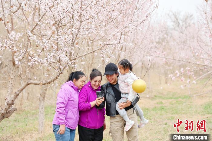 前來(lái)英吉沙縣賞花踏青的游客在杏園里回看剛拍攝的照片,臉上洋溢著幸福的笑容。英吉沙縣融媒體中心供圖
