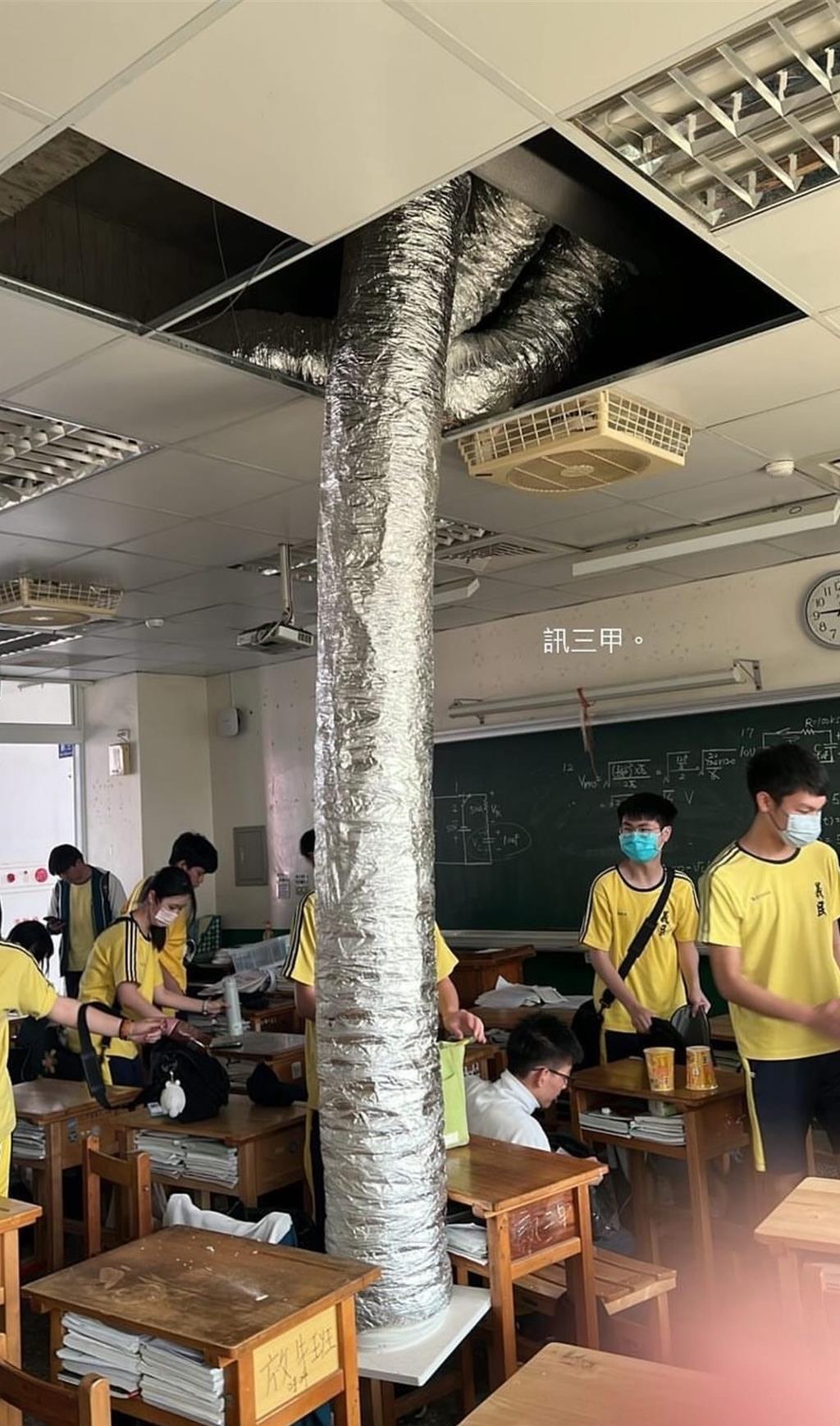 據(jù)義民中學(xué)學(xué)生指出,有教室出現(xiàn)空調(diào)冷氣管線脫落,直接垂落在課桌椅上,還有校舍地板出現(xiàn)龜裂,禮堂天花板也傳出有破損狀況。