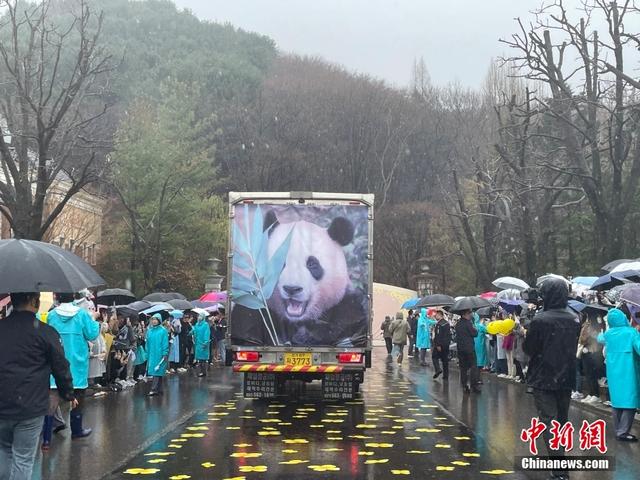 當(dāng)?shù)貢r間4月3日,旅韓大熊貓“福寶”離開位于韓國京畿道龍仁市的愛寶樂園,啟程返回中國。圖為當(dāng)?shù)孛癖娪曛兴蛣e“福寶”。中新社記者 劉旭 攝