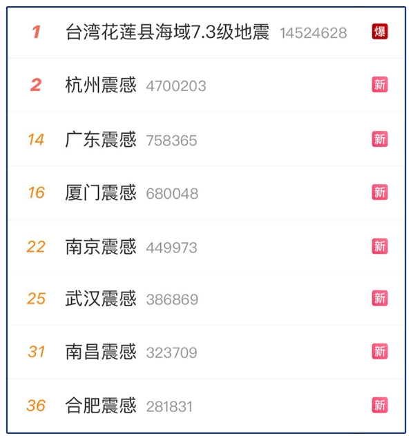 兩岸血濃于水,讓人感動的是,花蓮地震發(fā)生后,引起大陸網(wǎng)友高度關注,第一時間成為新浪微博熱搜榜榜首。截至3日晚23時,微博閱讀量已達11億,討論量288.9萬。