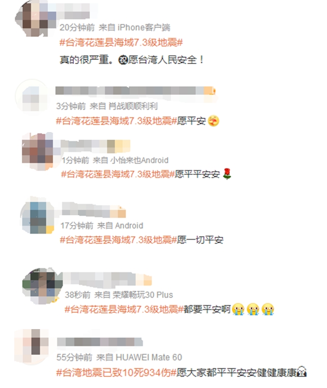 兩岸血濃于水,讓人感動的是,花蓮地震發(fā)生后,引起大陸網(wǎng)友高度關注,第一時間成為新浪微博熱搜榜榜首。幾乎所有大陸網(wǎng)友都在用自己的方式表達對同胞的關心,為臺灣祈福,希望臺灣同胞平安。