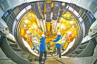 天津市濱海新區(qū),京津冀重點(diǎn)交通項(xiàng)目津沽海河隧道建設(shè)現(xiàn)場(chǎng)的“津城1號(hào)”盾構(gòu)機(jī)。該盾構(gòu)機(jī)應(yīng)用超大直徑盾構(gòu)推拼同步技術(shù),施工效率大幅提升。
