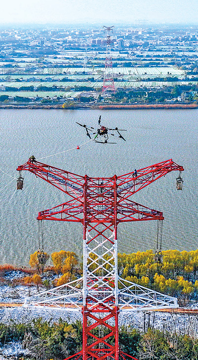江蘇省電網(wǎng)重點(diǎn)項(xiàng)目揚(yáng)州—鎮(zhèn)江±200千伏直流輸電線路工程夾江大跨越現(xiàn)場(chǎng),六旋翼無人機(jī)將牽引繩牽至對(duì)面江岸的鐵塔上。