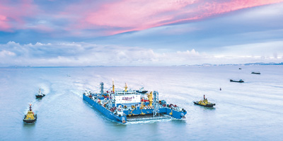 廣東省重點(diǎn)項(xiàng)目深中通道全長(zhǎng)24公里,集隧、島、橋、水下互通于一體,隧道沉管段由32個(gè)管節(jié)和一個(gè)最終接頭連接而成。圖為深中通道建設(shè)過程中,沉管運(yùn)輸安裝一體船“一航津安1”號(hào)將相關(guān)管節(jié)和最終接頭浮運(yùn)至安裝現(xiàn)場(chǎng)。