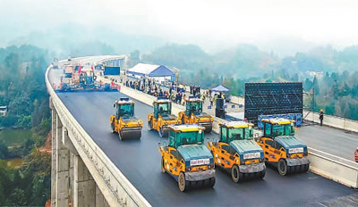 通過采用數(shù)字化智能施工集群,重慶市重點(diǎn)項(xiàng)目渝(重慶)湘(湖南)復(fù)線高速項(xiàng)目實(shí)現(xiàn)攤鋪機(jī)和壓路機(jī)智能規(guī)劃路徑、智能行駛以及自主協(xié)同作業(yè)。圖為無人攤鋪機(jī)群在進(jìn)行路面攤壓作業(yè)。