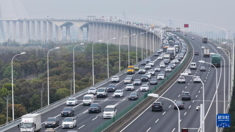 4月6日,在江蘇省常熟市,返程車流通過(guò)沈海高速蘇通大橋(無(wú)人機(jī)照片)。