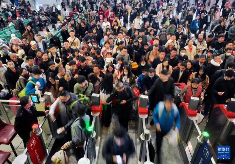 4月6日,在鐵路湖南衡陽(yáng)東站候車室,旅客排隊(duì)過(guò)閘機(jī)進(jìn)站(無(wú)人機(jī)照片)。