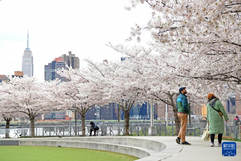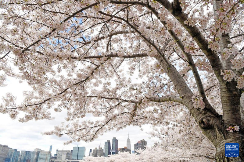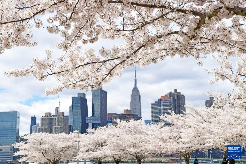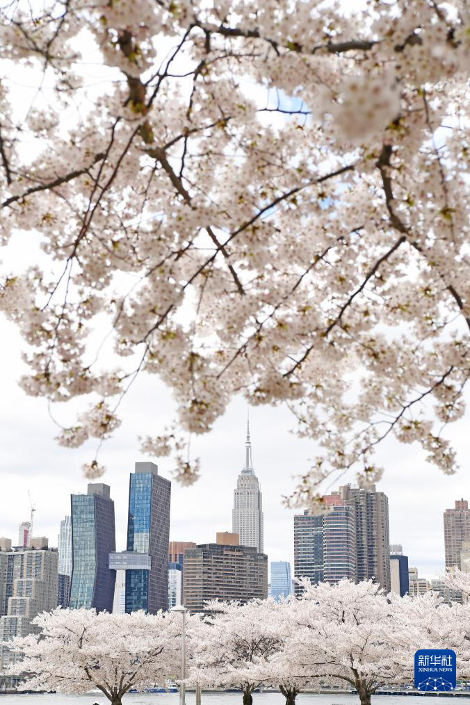 4月5日,在美國紐約,櫻花掩映遠(yuǎn)處的帝國大廈。