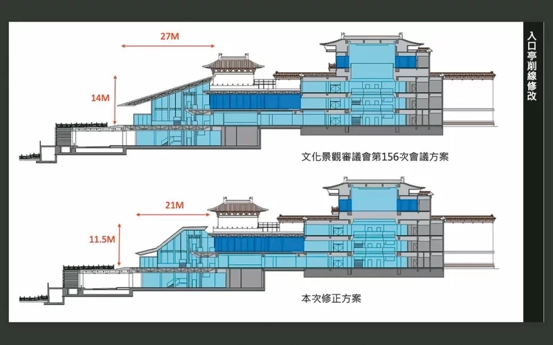 臺(tái)北故宮博物院北院整建最新方案,已將入口亭原斜屋頂做折面,總長(zhǎng)度從27米縮為21米,入口亭高度也從14米減為11.5米。圖/臺(tái)灣《聯(lián)合報(bào)》