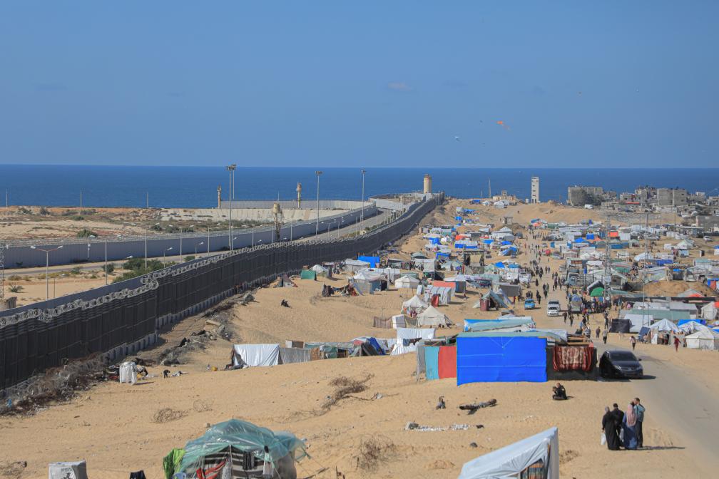 這是2月21日在加沙地帶南部城市拉法拍攝的加沙地帶和埃及邊境地區(qū)的臨時(shí)營(yíng)地。(圖源:新華社)