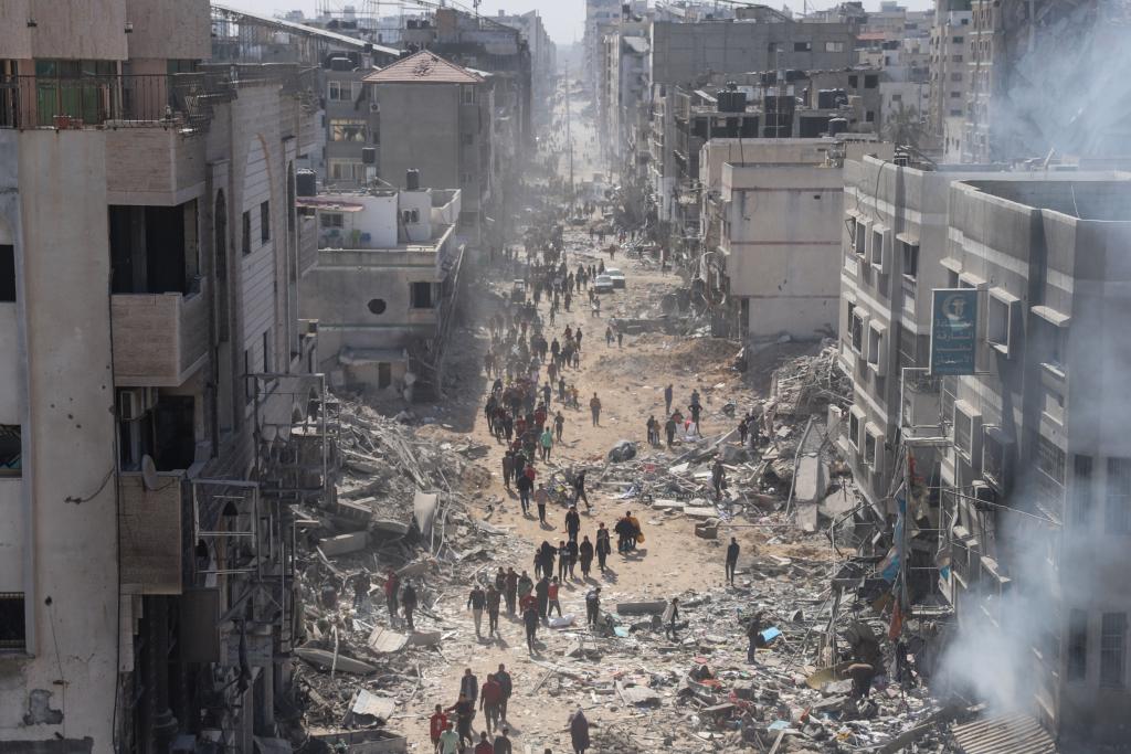 4月1日,在加沙地帶加沙城,人們走在希法醫(yī)院附近的街道上。(圖源:新華社)