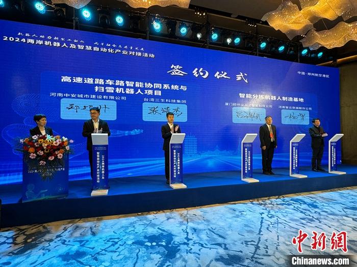 4月9日,2024兩岸機器人及智慧自動化產(chǎn)業(yè)對接活動在河南鄭州舉行,兩岸智能領域簽約了6個項目。圖為簽約現(xiàn)場。 中新社記者 闞力 攝