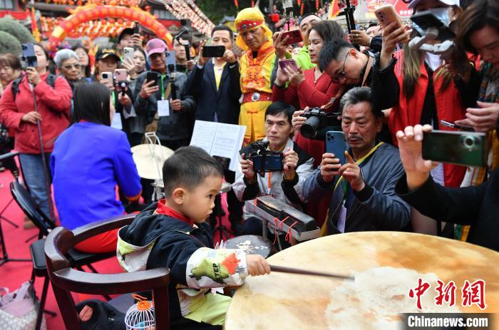 4月9日,“天下媽祖回娘家”啟動(dòng)儀式在福建省莆田市湄洲媽祖祖廟圣旨門廣場(chǎng)舉行,來自莆田湄洲島的3周歲萌娃蔡昱程(前)參與演奏“莆仙十音八樂”。中新社記者 呂明 攝