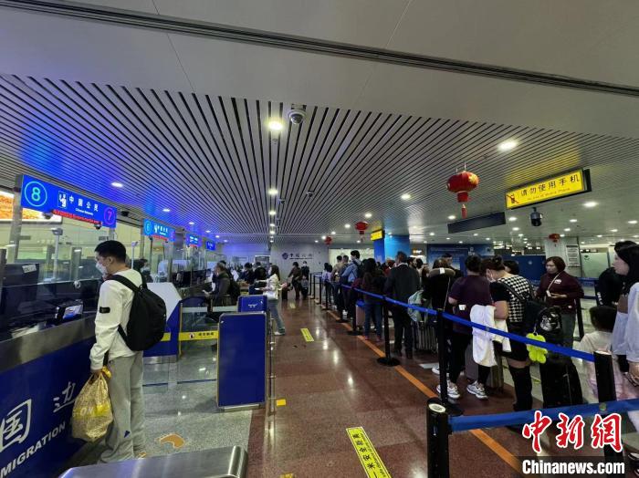 4月9日,旅客在福州長樂國際機(jī)場出境旅客查驗(yàn)大廳辦理入境通關(guān)手續(xù)。陳奕君 攝