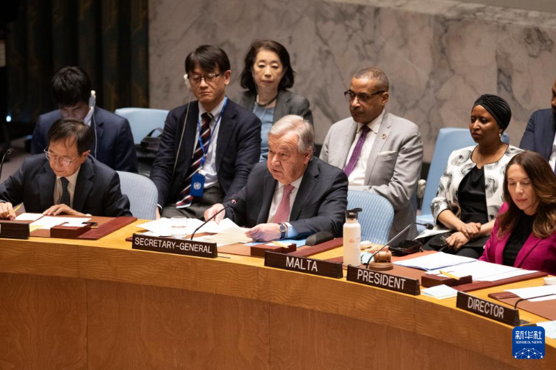4月14日,在位于紐約的聯(lián)合國總部,聯(lián)合國秘書長(zhǎng)古特雷斯(前中)在安理會(huì)就伊朗襲擊以色列舉行的緊急會(huì)議上講話。新華社記者 謝鍔 攝