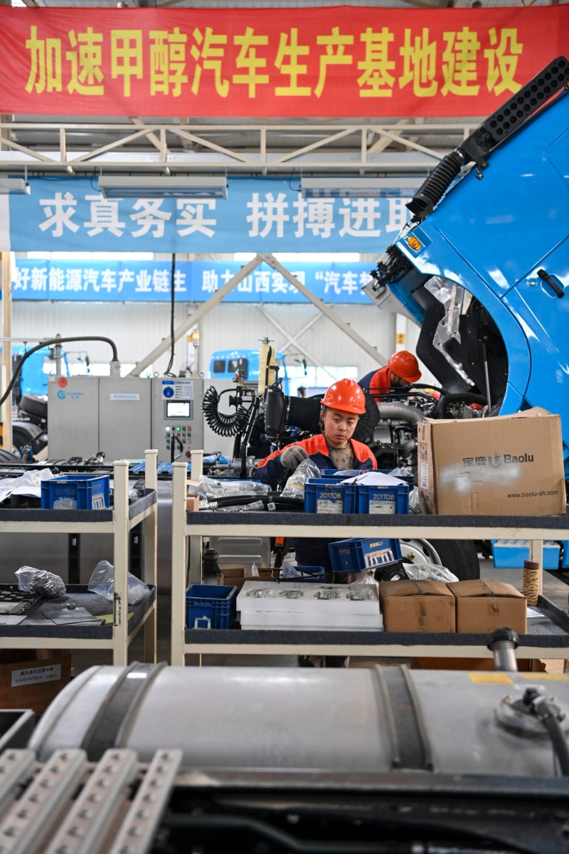 工作人員在位于山西省晉中市榆次區(qū)的山西新能源汽車(chē)工業(yè)有限公司(吉利晉中基地)生產(chǎn)甲醇重卡(4月1日攝)。新華社記者 楊晨光 攝