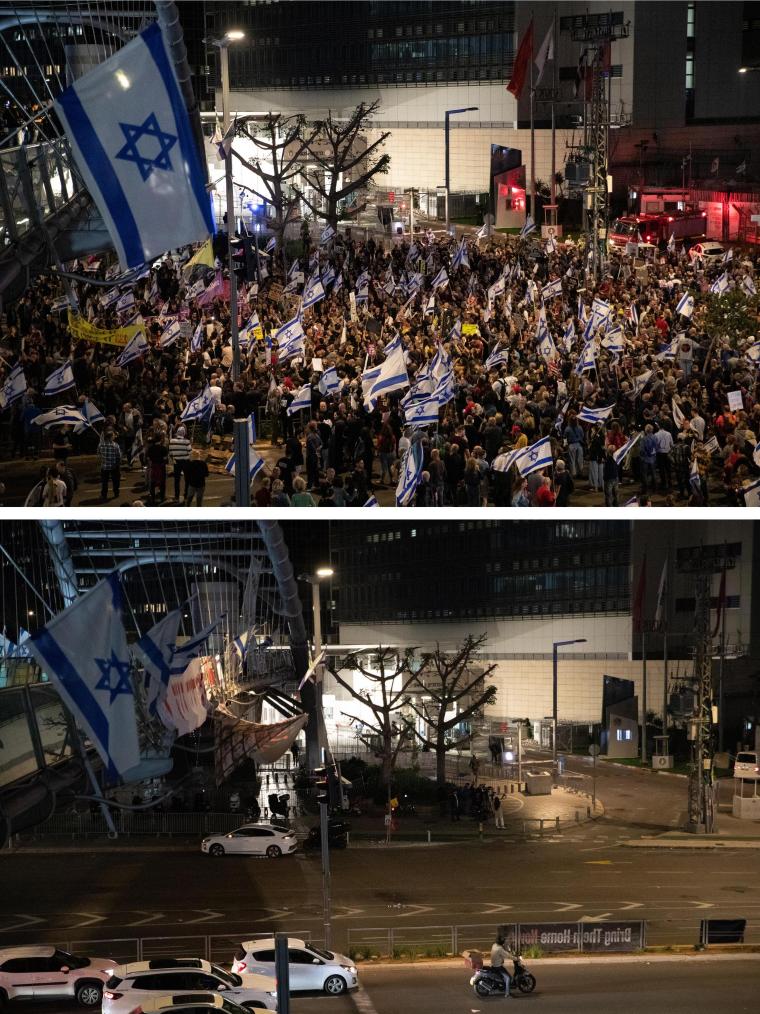 這張拼版照片顯示,上圖:4月13日晚,在以色列特拉維夫的以色列國防部前,民眾在安全警告生效前舉行示威集會;下圖:4月13日晚,在以色列特拉維夫的以色列國防部前參加示威集會的民眾在安全警告生效后散去。新華社記者陳君清攝