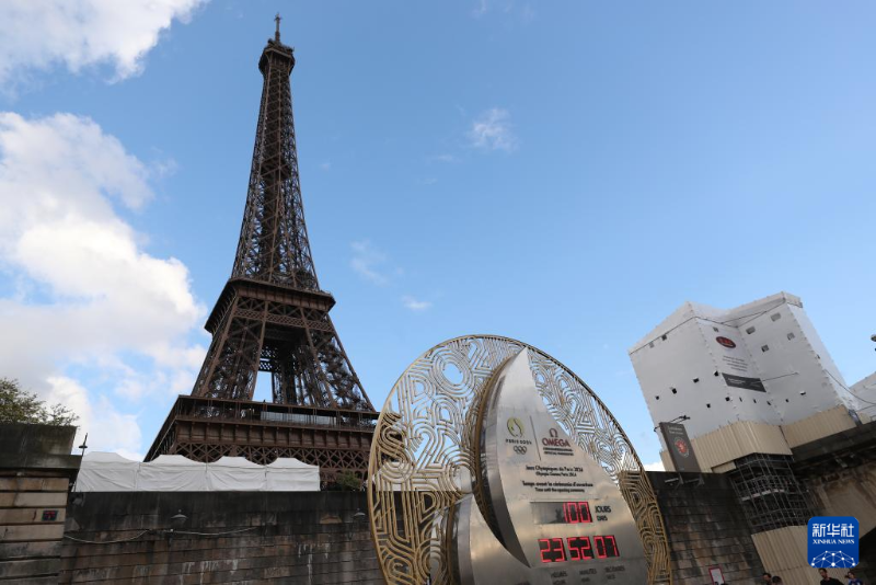 這是4月16日在法國巴黎埃菲爾鐵塔腳下拍攝的奧運會倒計時牌。新華社記者高靜攝