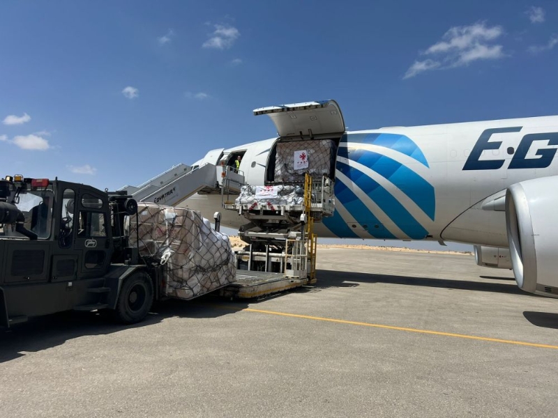2024年4月19日,工作人員在埃及阿里什機場卸載中國援助巴勒斯坦的物資。新華社發(fā)