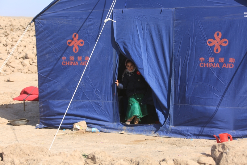 2023年10月16日,在阿富汗西北部赫拉特省津達詹地區(qū),兒童站在中國援助的帳篷門口。新華社發(fā)(塞夫拉赫曼·薩菲攝)