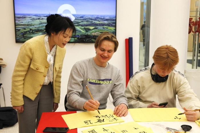 4月20日,在挪威首都奧斯陸,當?shù)孛癖娫谥形娜諔c?;顒由象w驗書法。新華社記者 張玉亮 攝