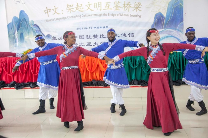 4月19日,在位于盧薩卡的贊比亞大學孔子學院,學生在中文日活動上表演舞蹈。新華社發(fā)(馬丁·姆班圭塔攝)