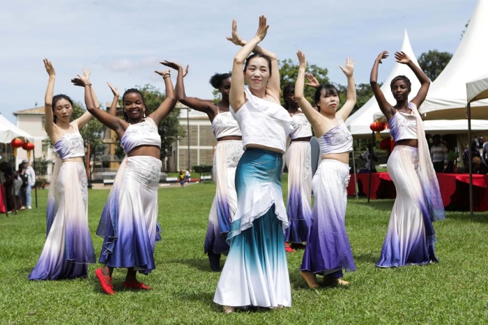 4月20日,在烏干達坎帕拉,中文師生在麥克雷雷大學舉行的中文日慶?;顒由媳硌葜袊璧腹?jié)目。新華社發(fā)(阿佳拉·納瓦達攝)