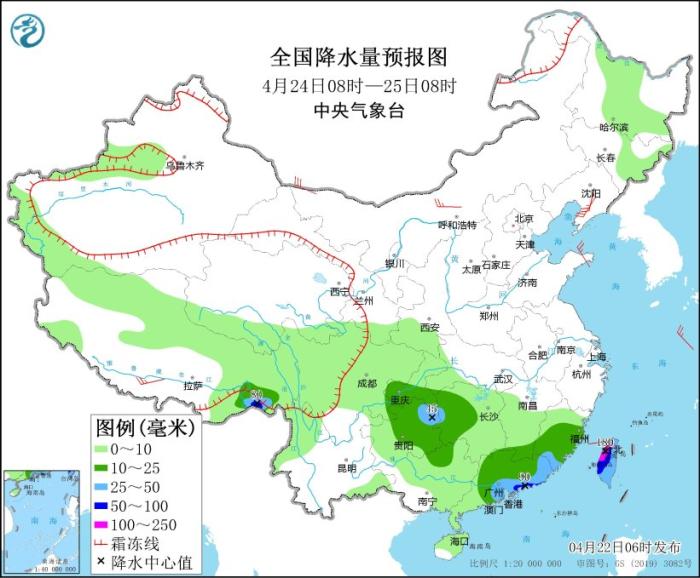 4月24日8時(shí)至25日8時(shí),西藏東南部、重慶南部、貴陽(yáng)中東部、湖南中西部、江西南部、廣西北部、廣東大部、福建中南部、臺(tái)灣島等地部分地區(qū)有中到大雨,其中,西藏東南部、廣東東南部沿海、臺(tái)灣島西部、西藏東南部等地部分地區(qū)有暴雨或大暴雨(100~180毫米)。內(nèi)蒙古中西部、遼東半島、山東半島、西藏南部等地部分地區(qū)有4~5級(jí)風(fēng)。