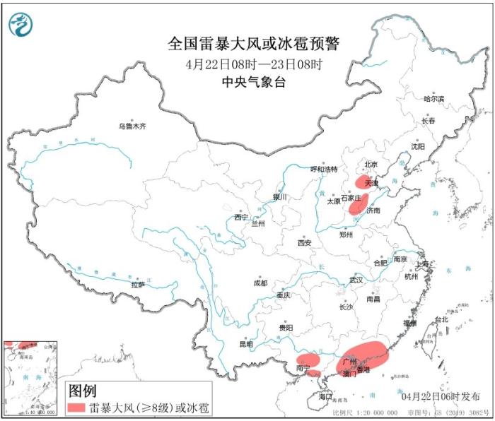預(yù)計(jì),4月22日8時(shí)至23日8時(shí),福建東南部、廣東中東部和南部、廣西東部等地部分地區(qū)有大到暴雨,其中,廣東東南部的部分地區(qū)有大暴雨(100~160毫米);河北中南部、天津西南部、山東北部、河南北部、廣西東南部及沿海、廣東中南部及沿海等地的部分地區(qū)將有8-10級(jí)雷暴大風(fēng)或冰雹天氣,局地風(fēng)力可達(dá)11級(jí)以上;福建東部和南部、貴州南部、廣西、廣東等地的部分地區(qū)將有短時(shí)強(qiáng)降水天氣,最大小時(shí)雨量30-50毫米,局地可達(dá)70毫米以上。中央氣象臺(tái)4月22日6時(shí)發(fā)布暴雨黃色預(yù)警和強(qiáng)對(duì)流天氣藍(lán)色預(yù)警。