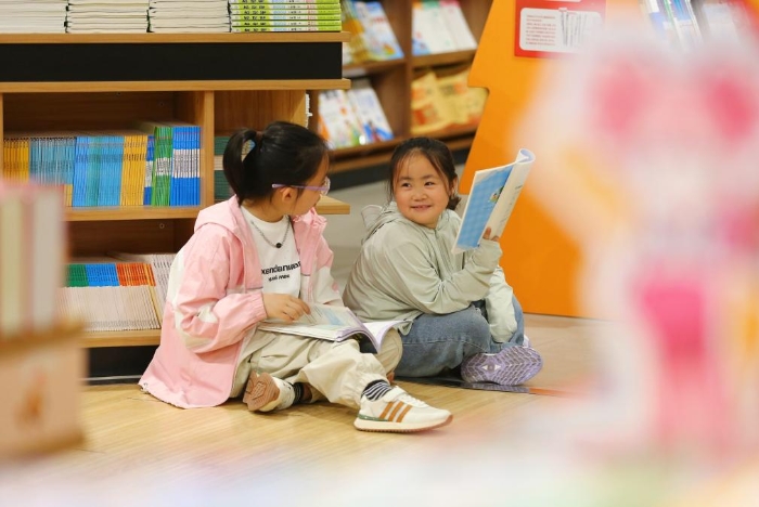 4月21日,兩名小朋友在山東省滕州市新華書店內(nèi)交流。新華社發(fā)(李志軍攝)