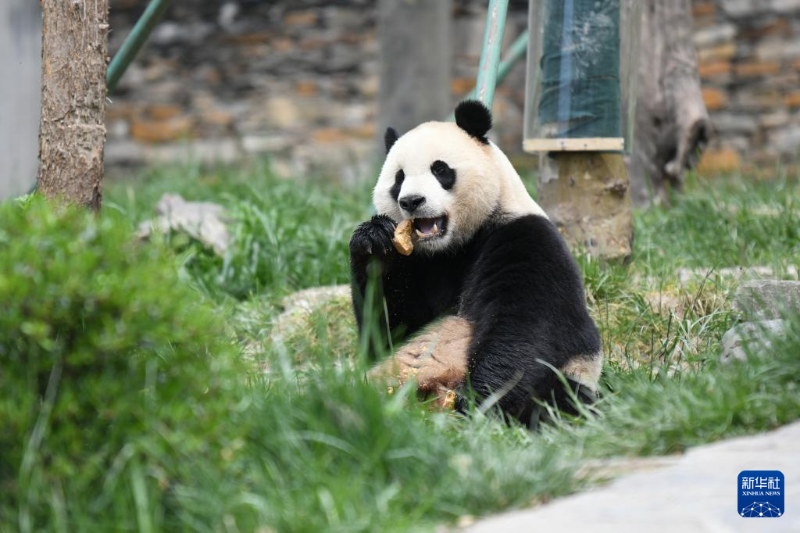 4月16日,在中國大熊貓保護研究中心神樹坪基地,大熊貓“小奇跡”在吃窩窩頭。大熊貓“小奇跡”,雄性,2020年8月21日出生于美國華盛頓國家動物園,目前在中國大熊貓保護研究中心臥龍神樹坪基地。