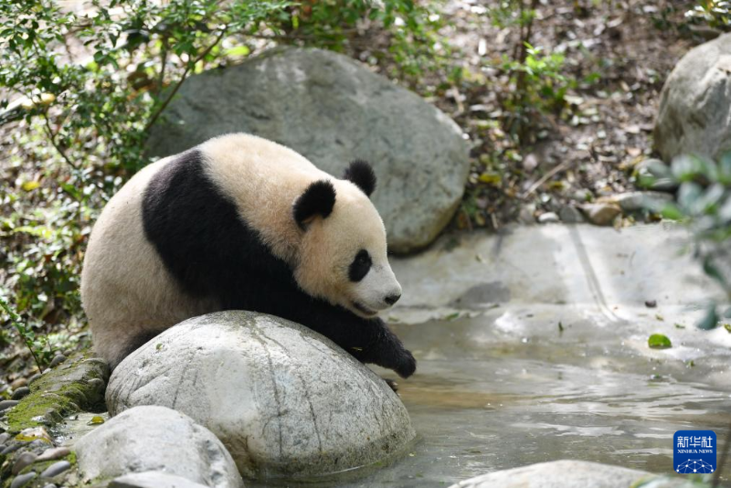 4月21日,在成都大熊貓繁育研究基地,大熊貓“夢想”在水池邊休息。大熊貓“夢想”“夢圓”,均為雄性,2019年9月1日出生于德國柏林動物園,目前在成都大熊貓繁育研究基地。