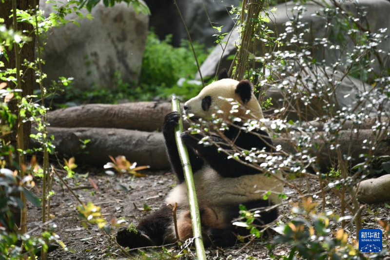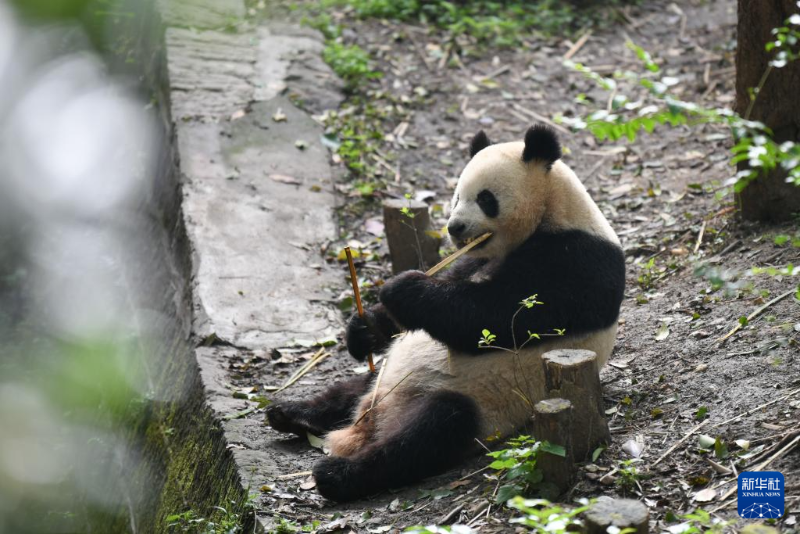4月19日,在中國大熊貓保護研究中心都江堰基地,大熊貓“叻叻”在吃竹子。大熊貓“叻叻”,雄性,2021年8月14日出生于新加坡河川生態(tài)園,目前在中國大熊貓保護研究中心都江堰基地。