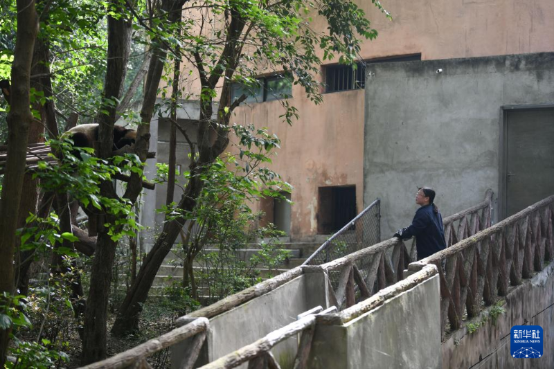 4月21日,在成都大熊貓繁育研究基地,飼養(yǎng)員在觀察大熊貓“圓夢”情況。大熊貓“圓夢”,雄性,2017年8月4日出生于法國博瓦勒動物園,目前在成都大熊貓繁育研究基地。