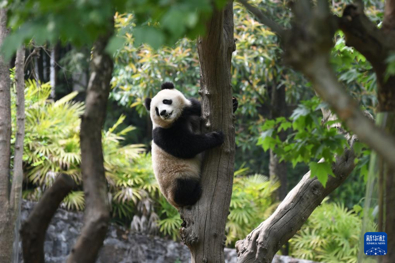 4月19日,在中國大熊貓保護研究中心都江堰基地,大熊貓“叻叻”在爬樹。大熊貓“叻叻”,雄性,2021年8月14日出生于新加坡河川生態(tài)園,目前在中國大熊貓保護研究中心都江堰基地。