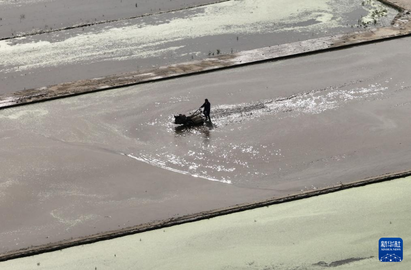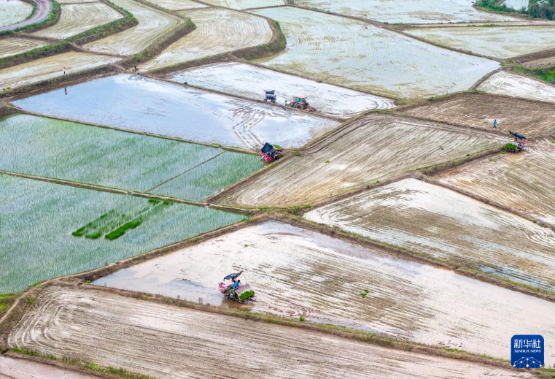 4月23日,在四川省廣安市廣安區(qū)花橋鎮(zhèn),農(nóng)民駕駛插秧機栽插水稻秧苗(無人機照片)。