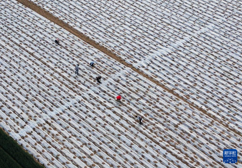4月23日,山東省臨沂市平邑縣地方鎮(zhèn)農(nóng)民在覆膜花生種植基地里勞作(無人機照片)。