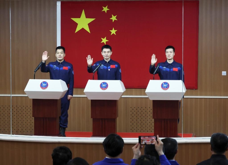 4月24日,神舟十八號(hào)載人飛行任務(wù)航天員葉光富(中)、李聰(右)、李廣蘇在酒泉衛(wèi)星發(fā)射中心問天閣與媒體記者集體見面。新華社記者 金立旺 攝