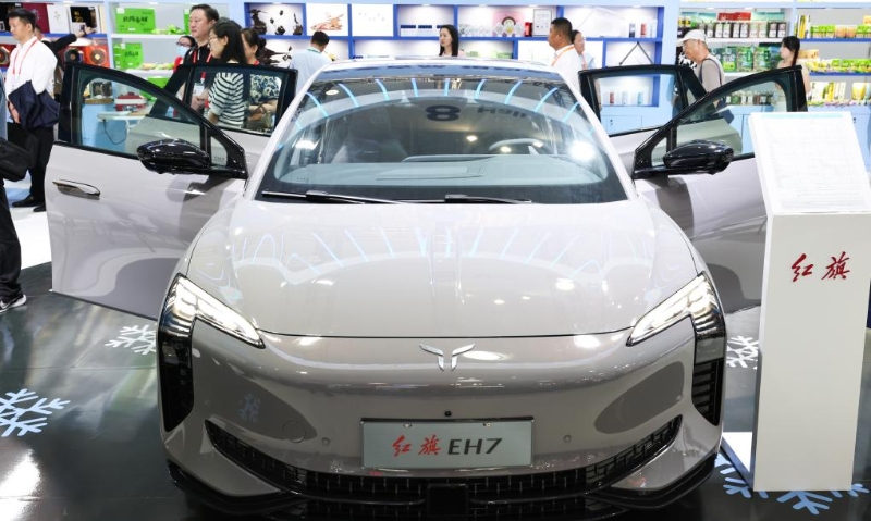 這是在第四屆中國國際消費(fèi)品博覽會(huì)上展出的紅旗新能源汽車(2024年4月13日攝)。新華社記者楊冠宇攝