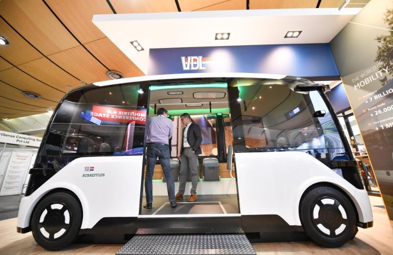 4月23日,人們?cè)诘聡鴿h諾威工博會(huì)上參觀一款無人駕駛汽車。新華社記者任鵬飛攝