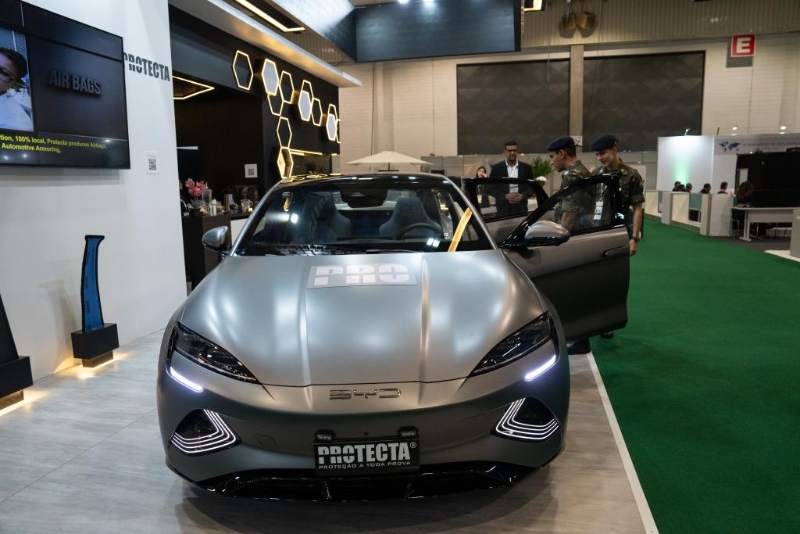4月4日,在巴西圣保羅舉行的巴西防務(wù)展上,參觀者體驗(yàn)一輛經(jīng)過防彈加固的比亞迪海豹電動(dòng)汽車。新華社記者王天聰攝