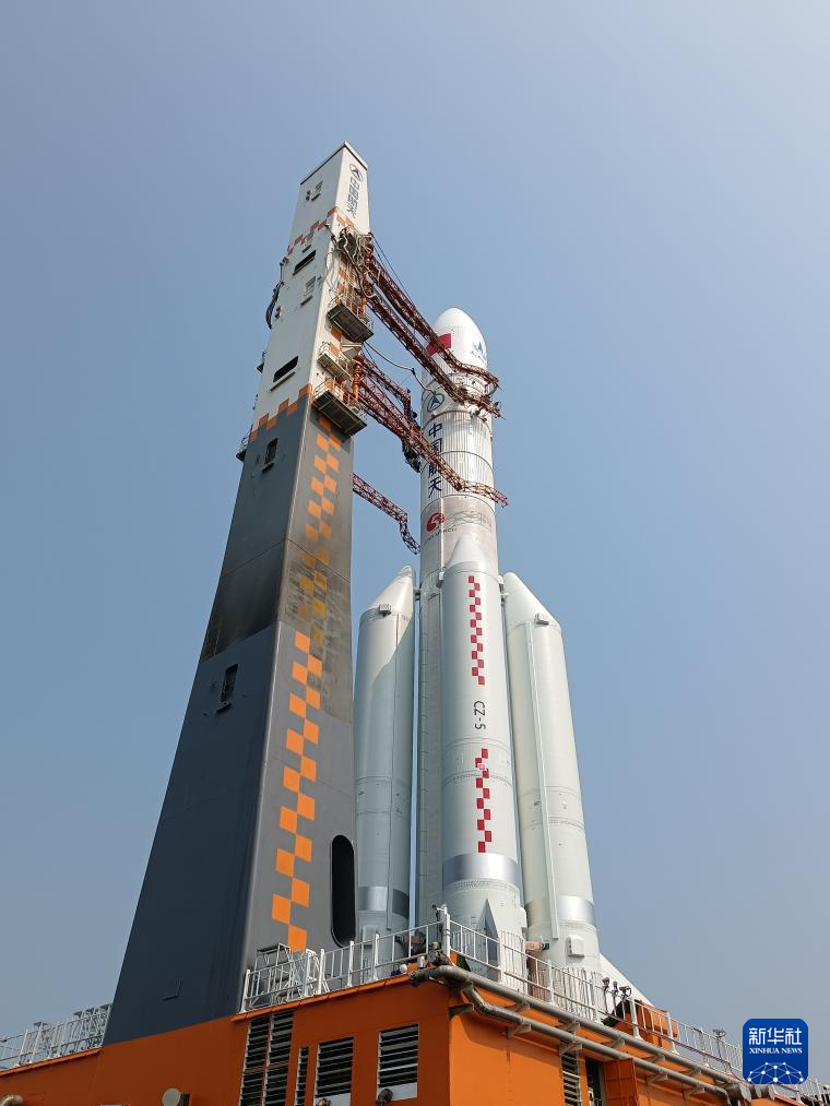 4月27日,嫦娥六號探測器和長征五號遙八運載火箭器箭組合體在垂直轉(zhuǎn)運中。