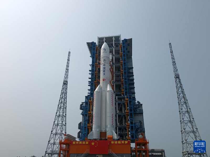 4月27日,嫦娥六號探測器和長征五號遙八運載火箭器箭組合體垂直轉(zhuǎn)運至發(fā)射區(qū)。